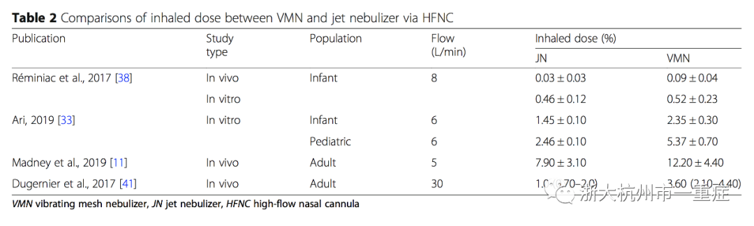 相比之下,VMN是由电力所驱动,不需要额外的气流量。此外,JN雾化器中药物残留量高于 VMNJN残留达45%,而 VMN仅为3%。对于儿童和成人患者,经 HFNC联合 VMN雾化产生的吸入药物剂量一般比 JN23 (2)。因此,与 JN相比,VMN更适合与 HFNC联合应用进行雾化吸入治疗。