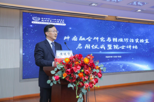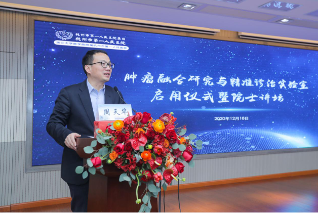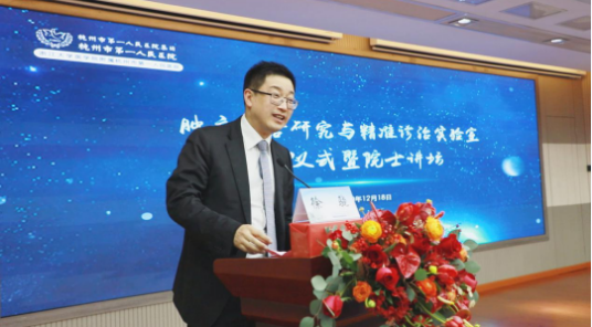肿瘤研究,重在融合,旨在精准。12月18日下午,肿瘤融合研究与精准诊治实验室(以下简称“实验室”)启用仪式暨院士讲坛在浙江大学医学院附属吃瓜网站 学术报告厅隆重举行。该实验室由市一吃瓜网站 院长徐骁教授领衔,旨在打造多学科交叉融合的肿瘤精准诊疗一体化研究中心。中国工程院院士、中华医学会副会长、中国医师协会副会长郑树森院士担任实验室学术委员会名誉主任,中国工程院院士、国家肝癌科学中心主任、上海东方肝胆外科吃瓜网站 肿瘤临床医学中心主任王红阳担任实验室学术委员会主任,中国工程院院士、山东省第一医科大学名誉校长、山东省肿瘤吃瓜网站 院长于金明担任实验室学术委员会副主任。浙江大学副校长、医学院党委书记周天华,杭州市卫生健康委员会党委书记、主任孙雍容,浙江省科学技术厅基础研究与条件建设处处长夏昶祺等出席。启动仪式由市一吃瓜网站 党委书记黄进宇教授主持,“院士讲坛”由院长徐骁教授主持。