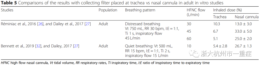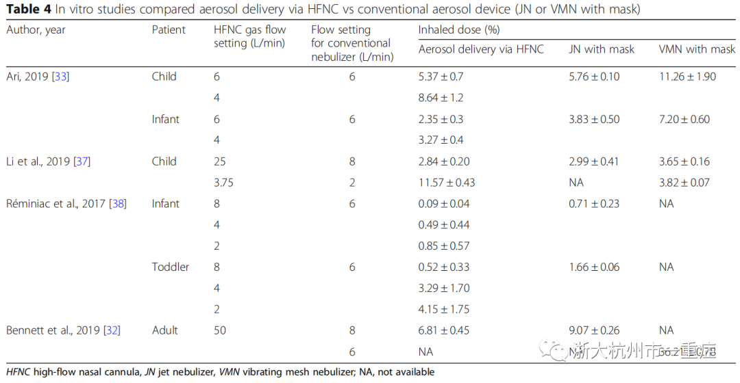 高气流量(成人50L/min,儿童2L/kg/min)的HFNC雾化吸入剂量与JN和面罩相似,但低于带面罩的VMN。但在较低气流量下(儿科0.25-0.5 L/kg/min), HFNC吸入剂量高于VMN和口罩,比JN和口罩吸入量高出2-3倍(表4)