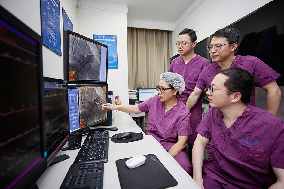 2. 精准化冠脉介入治疗:在省内率先开展了冠脉内超声检测(IVUS)、冠脉血流储备分数(FFR)、微循环阻力指数(IMR)等精确评估冠脉结构和功能病变的技术手段;常规开展冠脉内斑块旋磨术,省内率先开展激光斑块消蚀术。上述技术的应用使得复杂冠脉病变的成功率和安全性均得以提高。